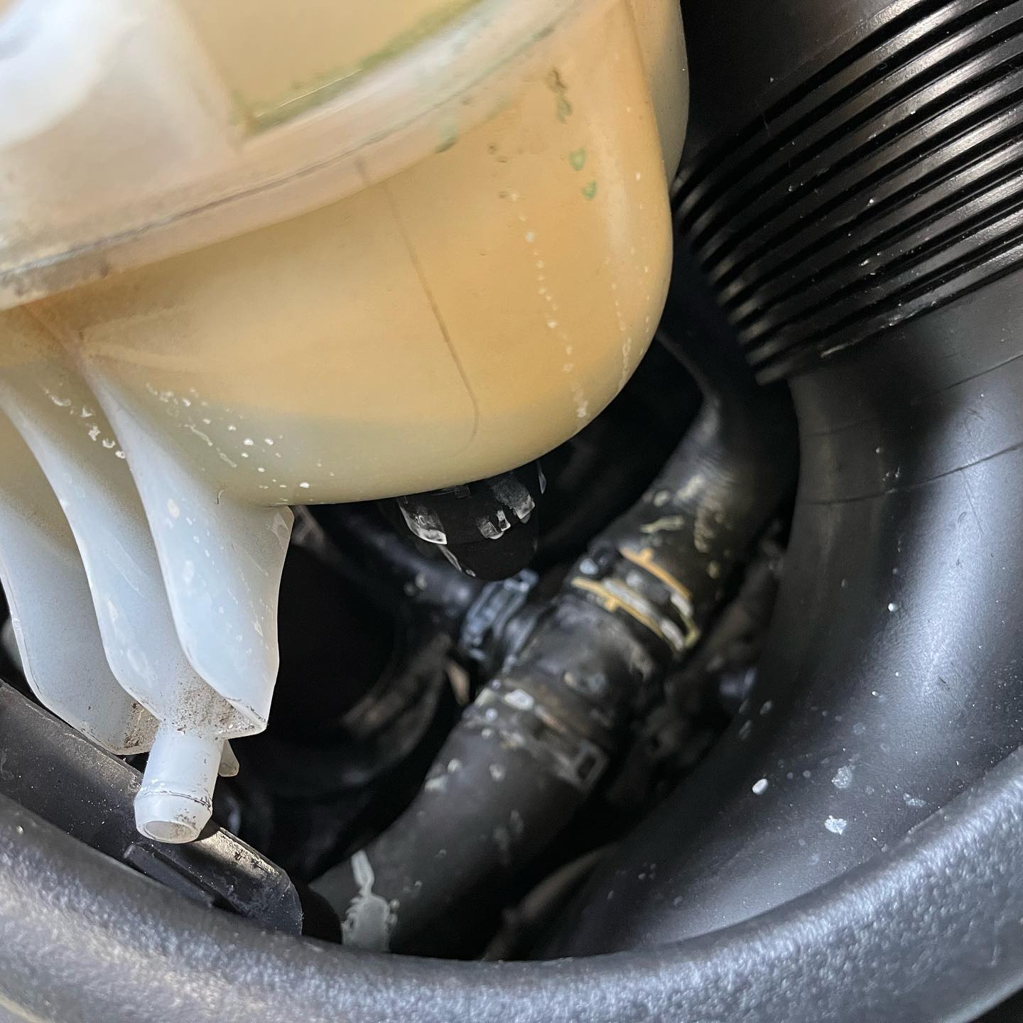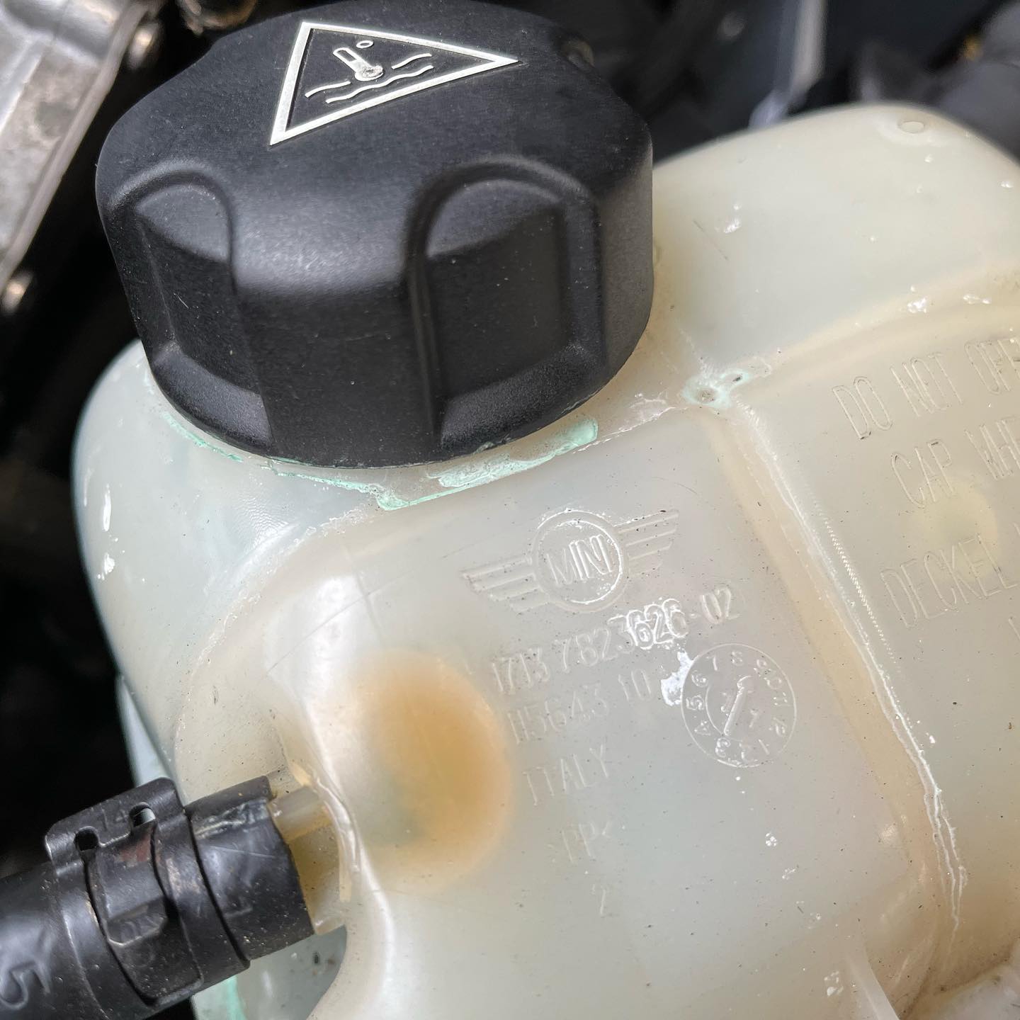 ボンネットを開けたところ、ラジエターリザーブタンクのキャップからクーラント漏れを発見。