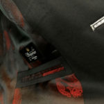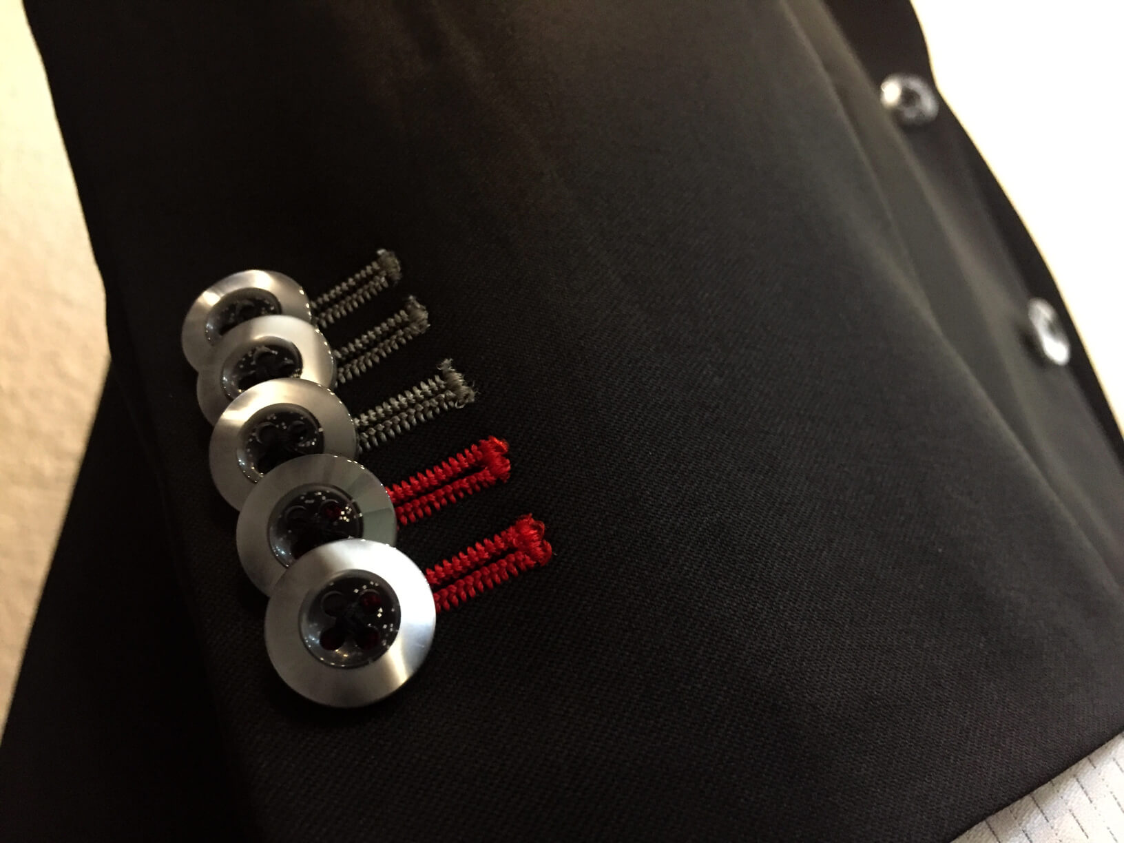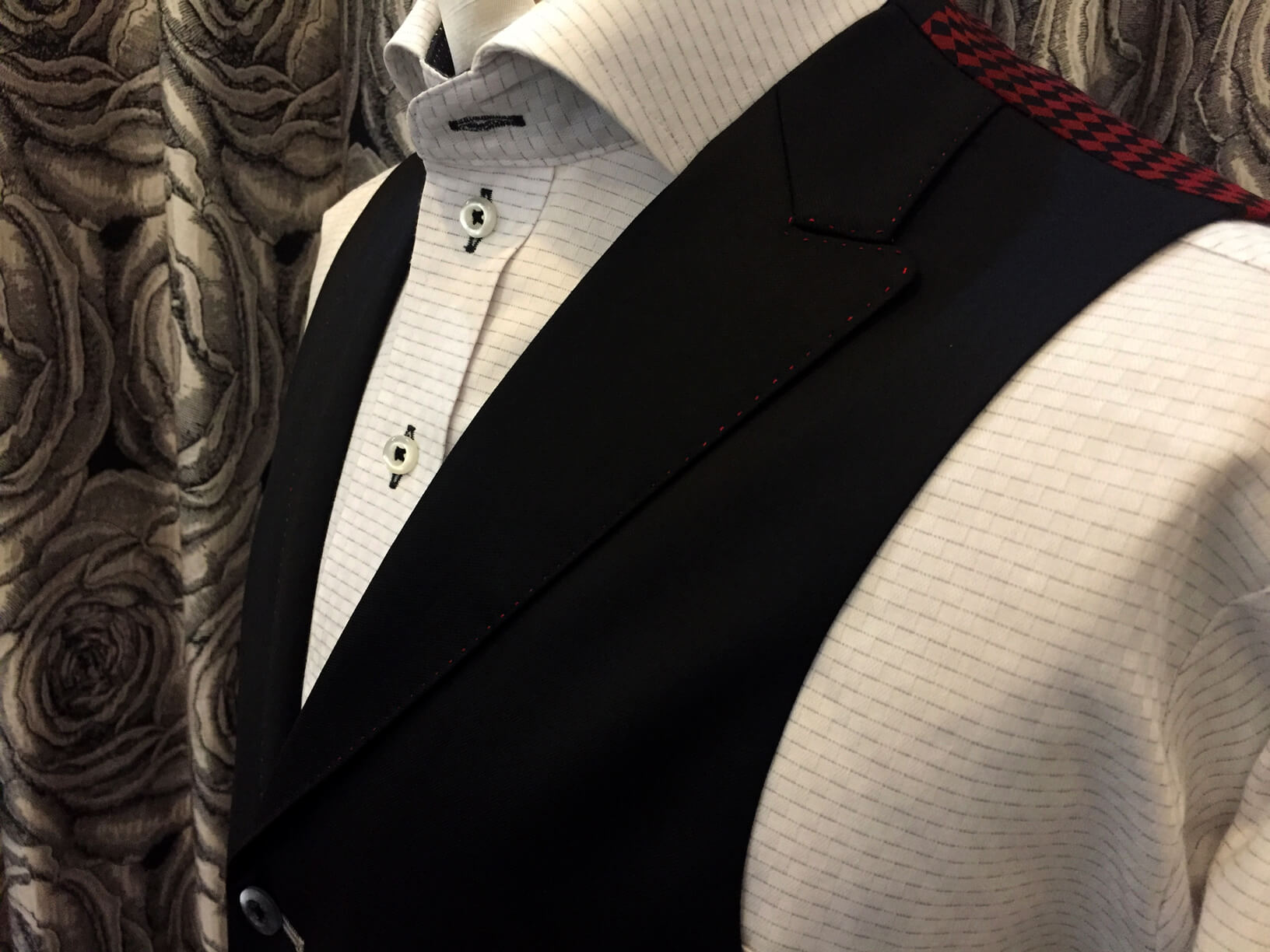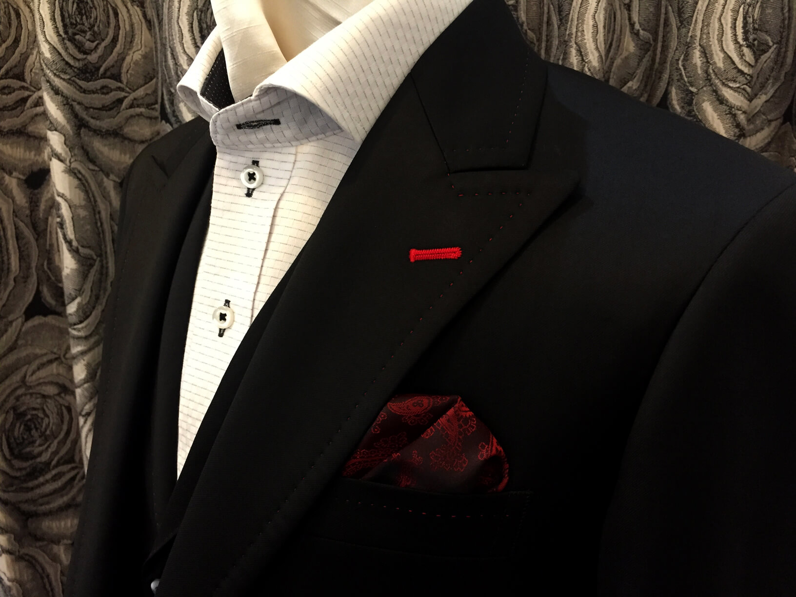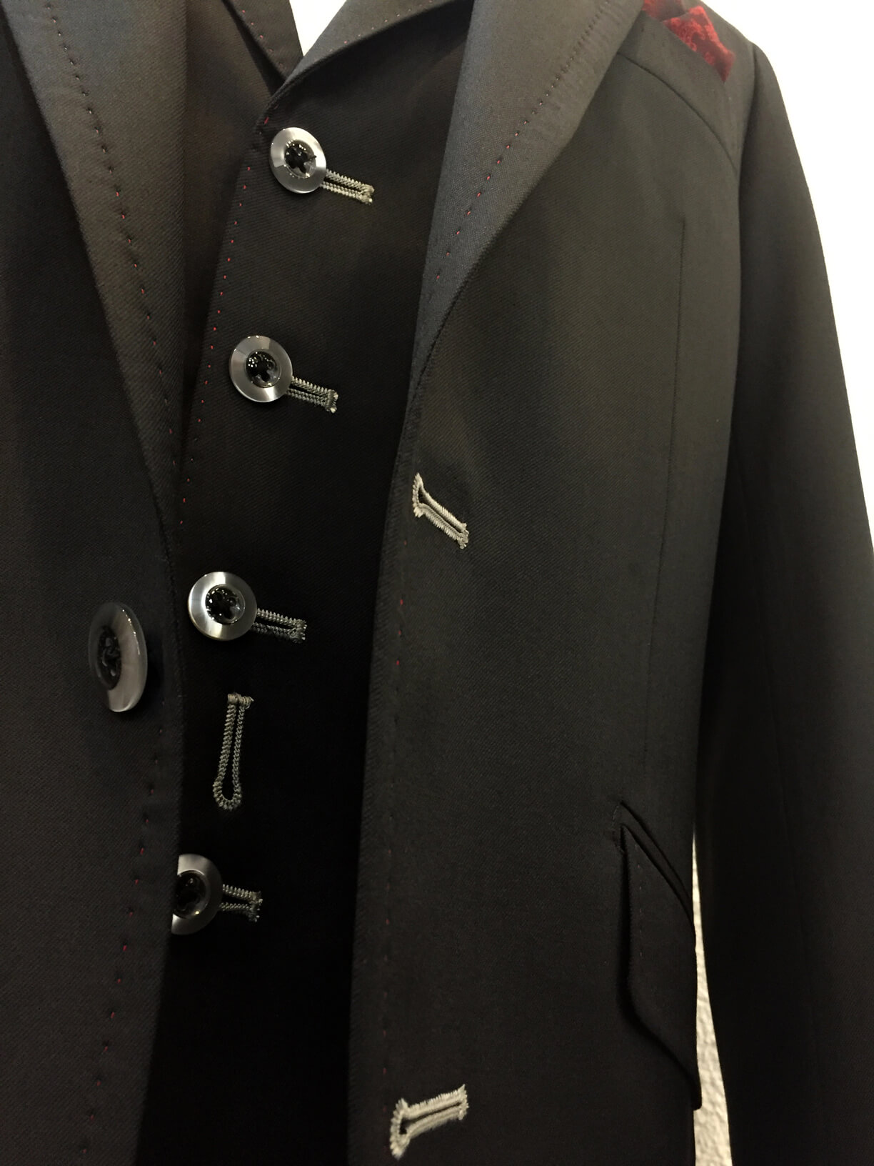 印象を左右するジャケットの襟には大胆に赤色10mm幅のステッチを施し遊び心のある1着に*