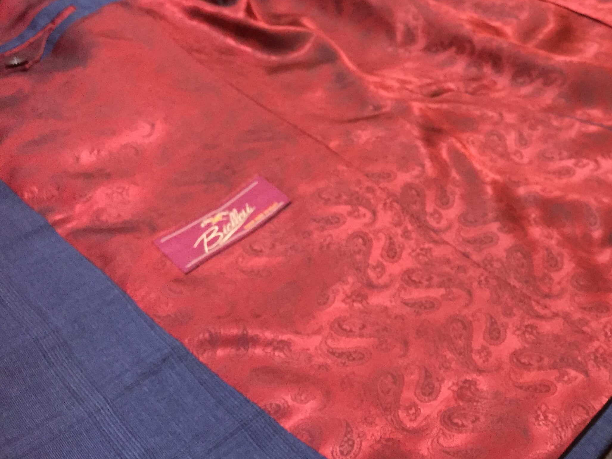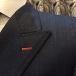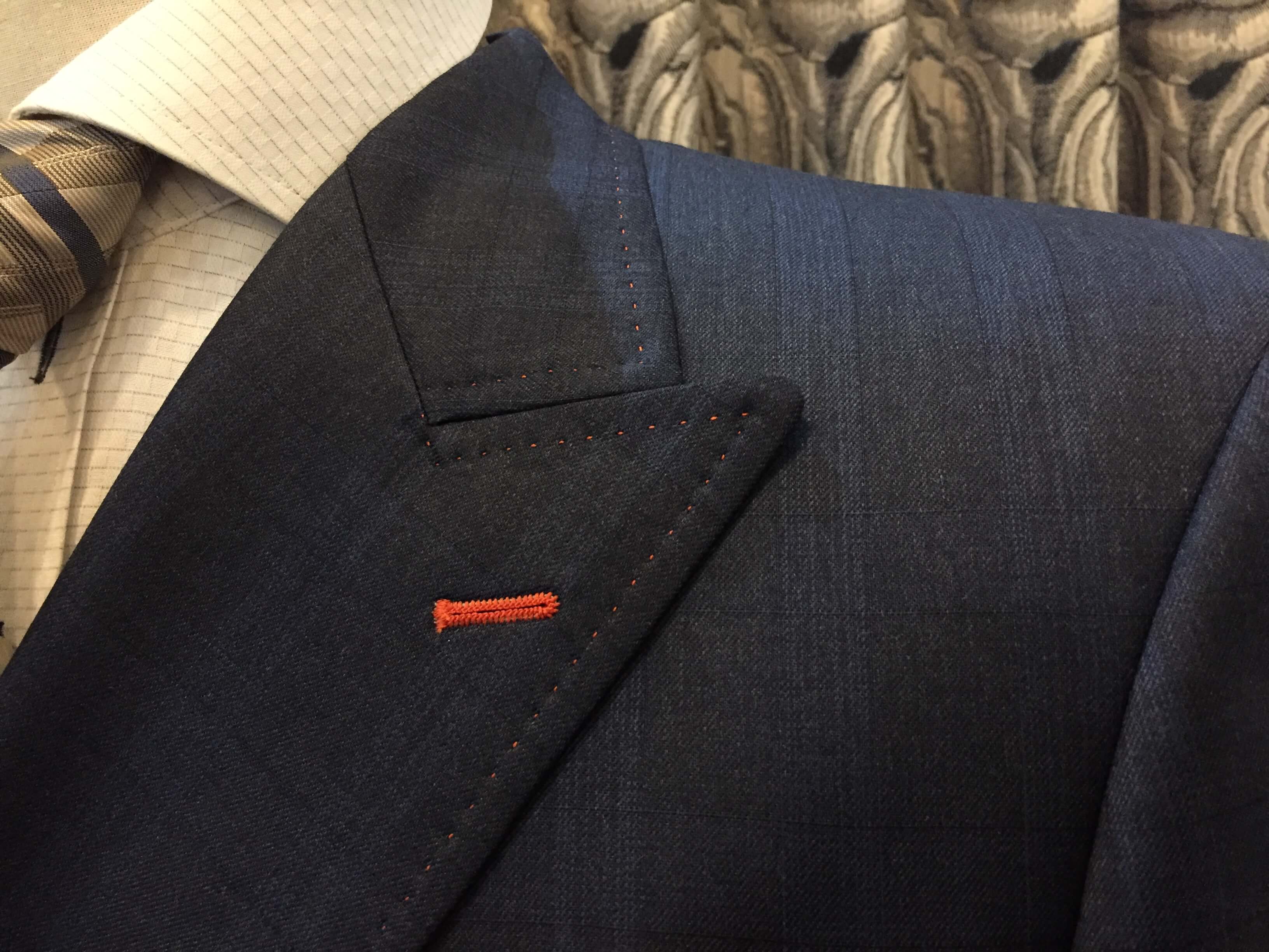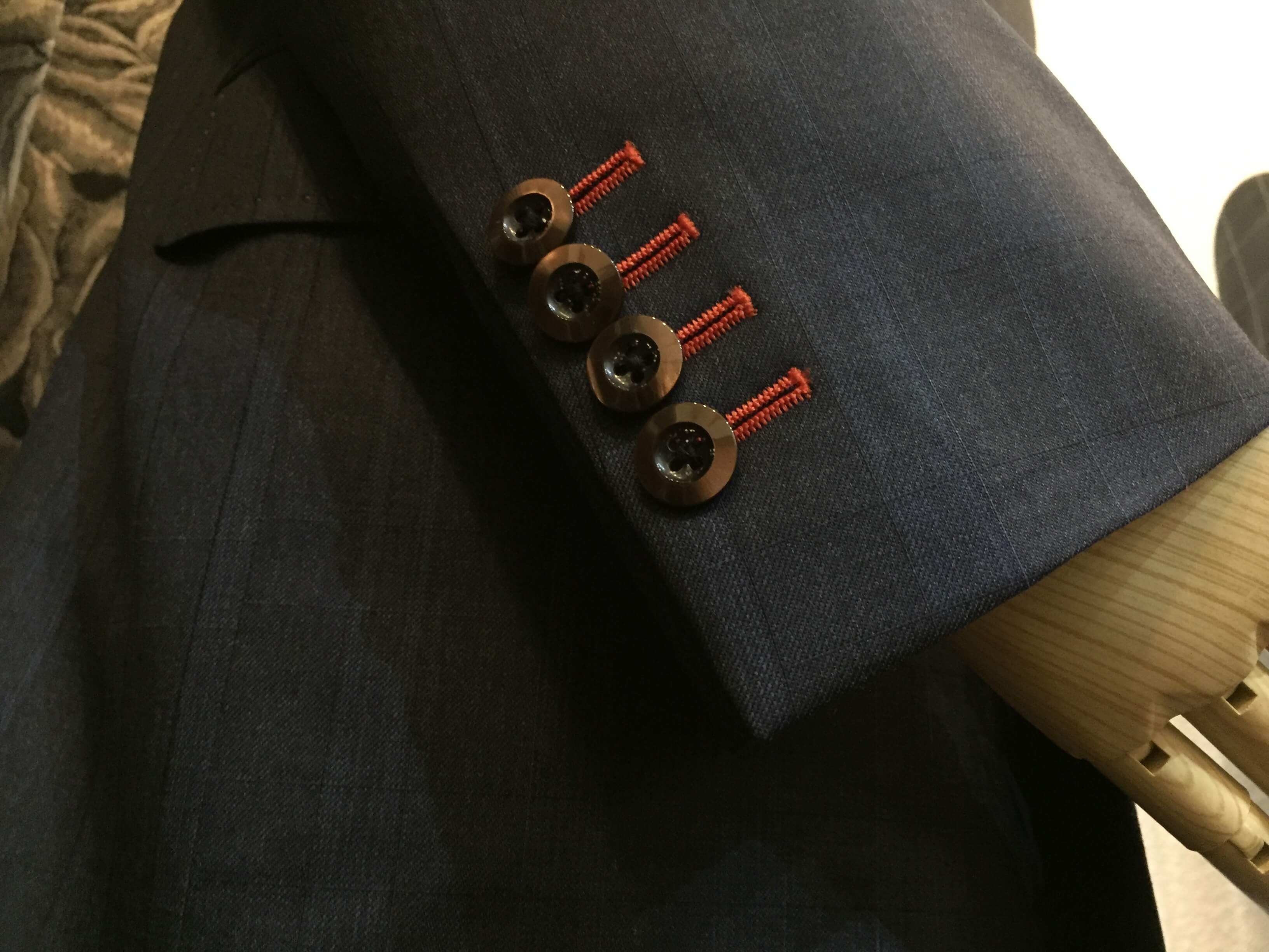 コーポレートカラーであるオレンジ色を釦のホール糸や裏地に取り入れ完成*