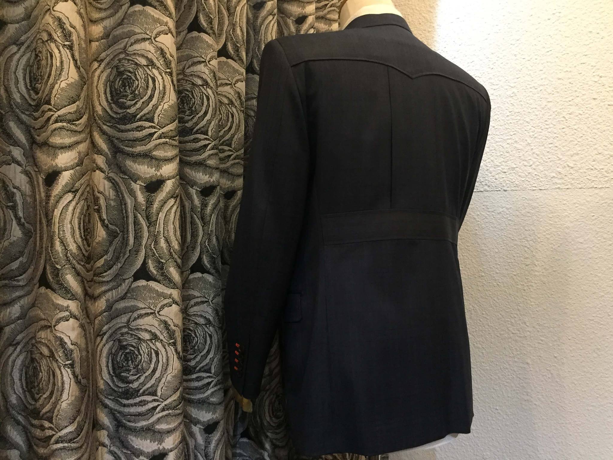 やや広めのラペル幅にウィングデザインのヨーク、背バンド付のバックスタイルなど
