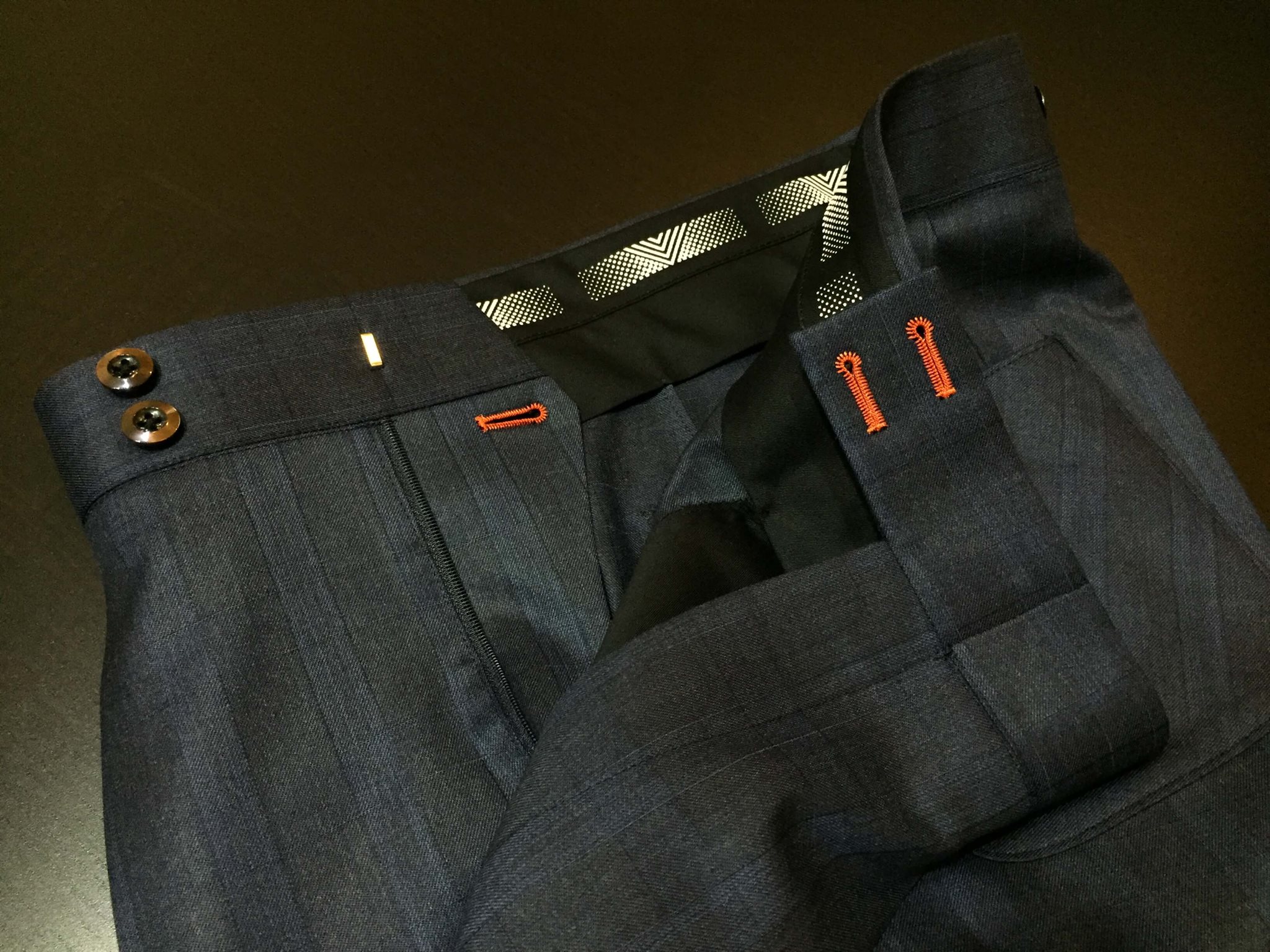 スラックスの帯はやや広めにし、サスペンダー着用可能な仕様に。
