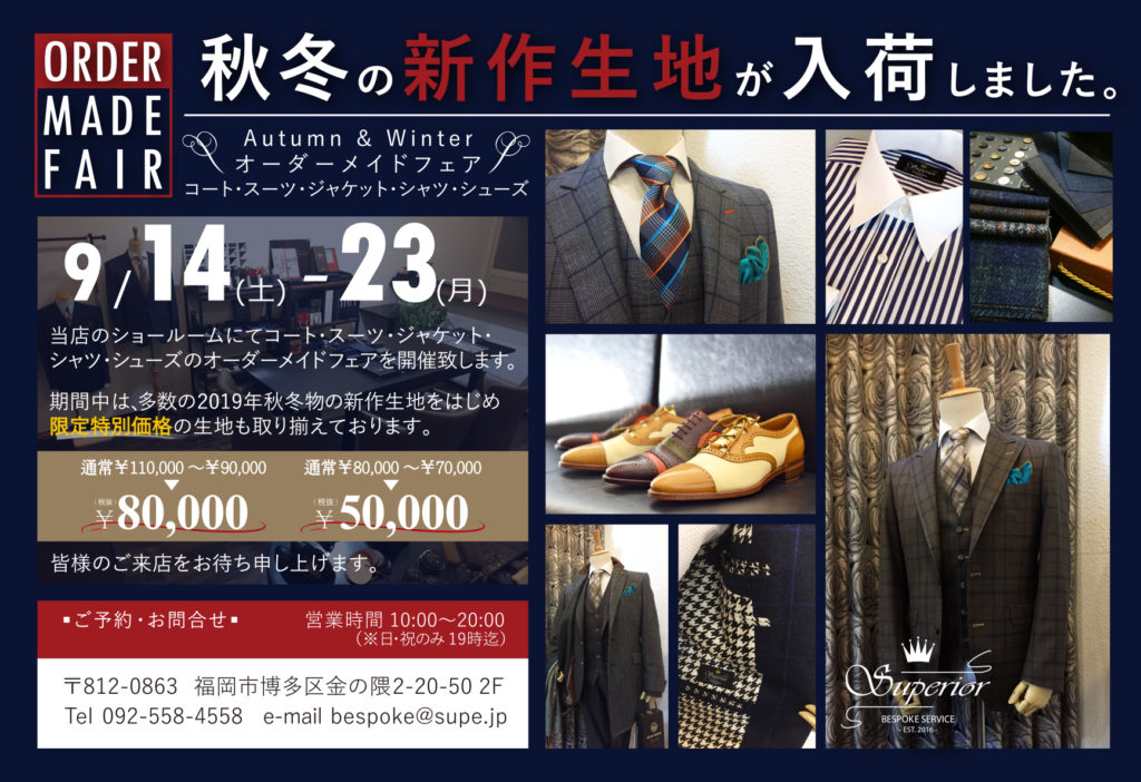 当店のショールームにてOrder Made Fair 2019 Autumn & Winterを開催いたします。