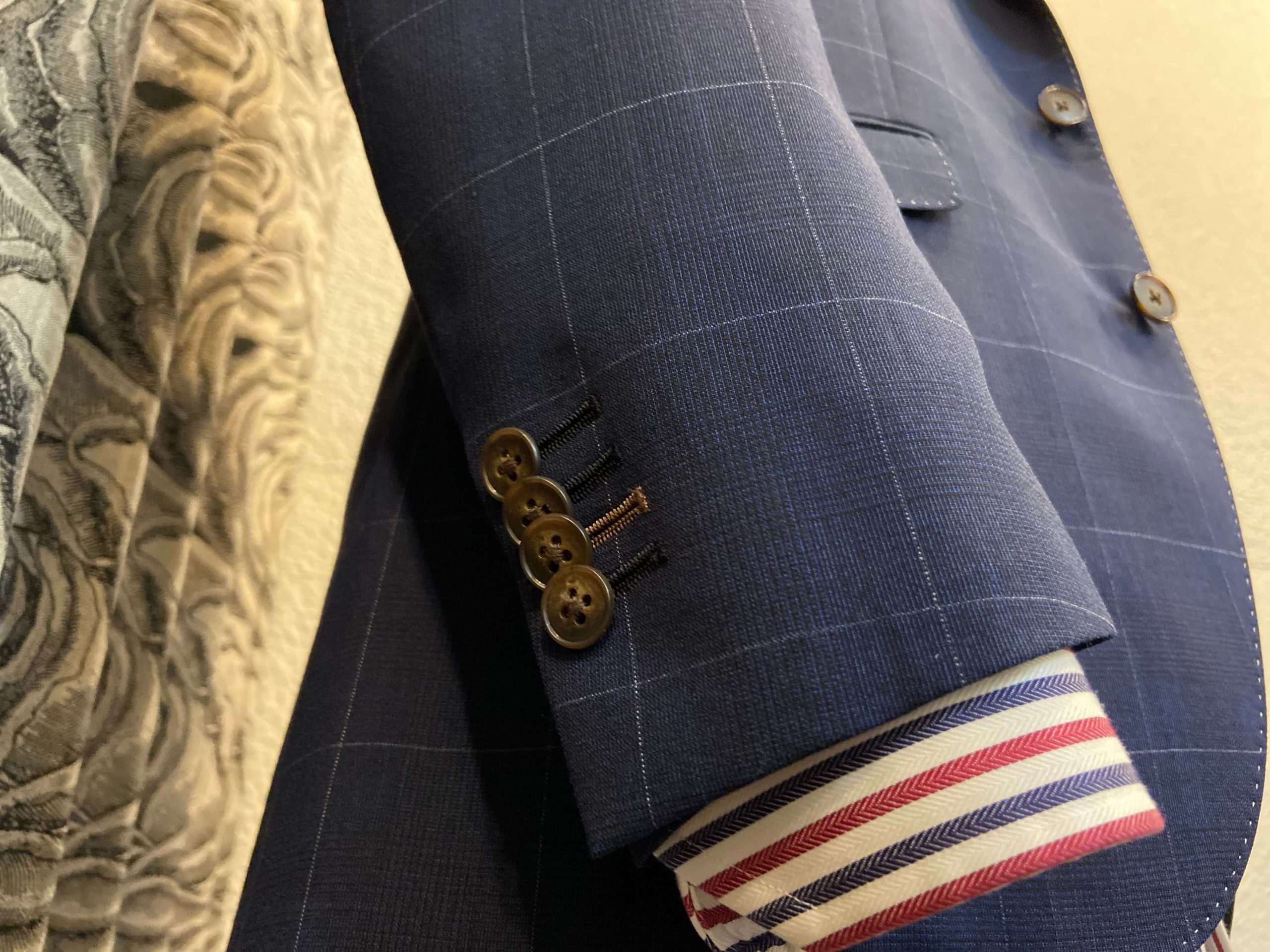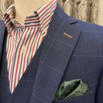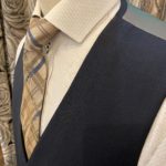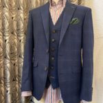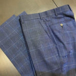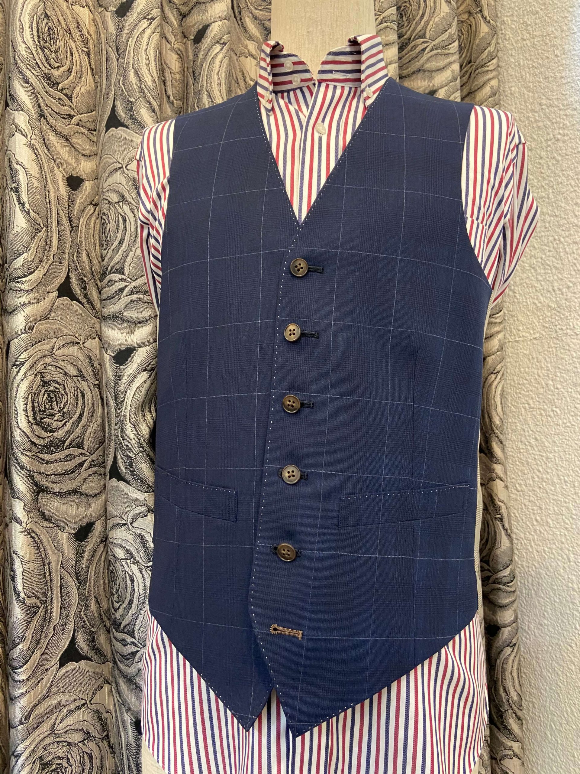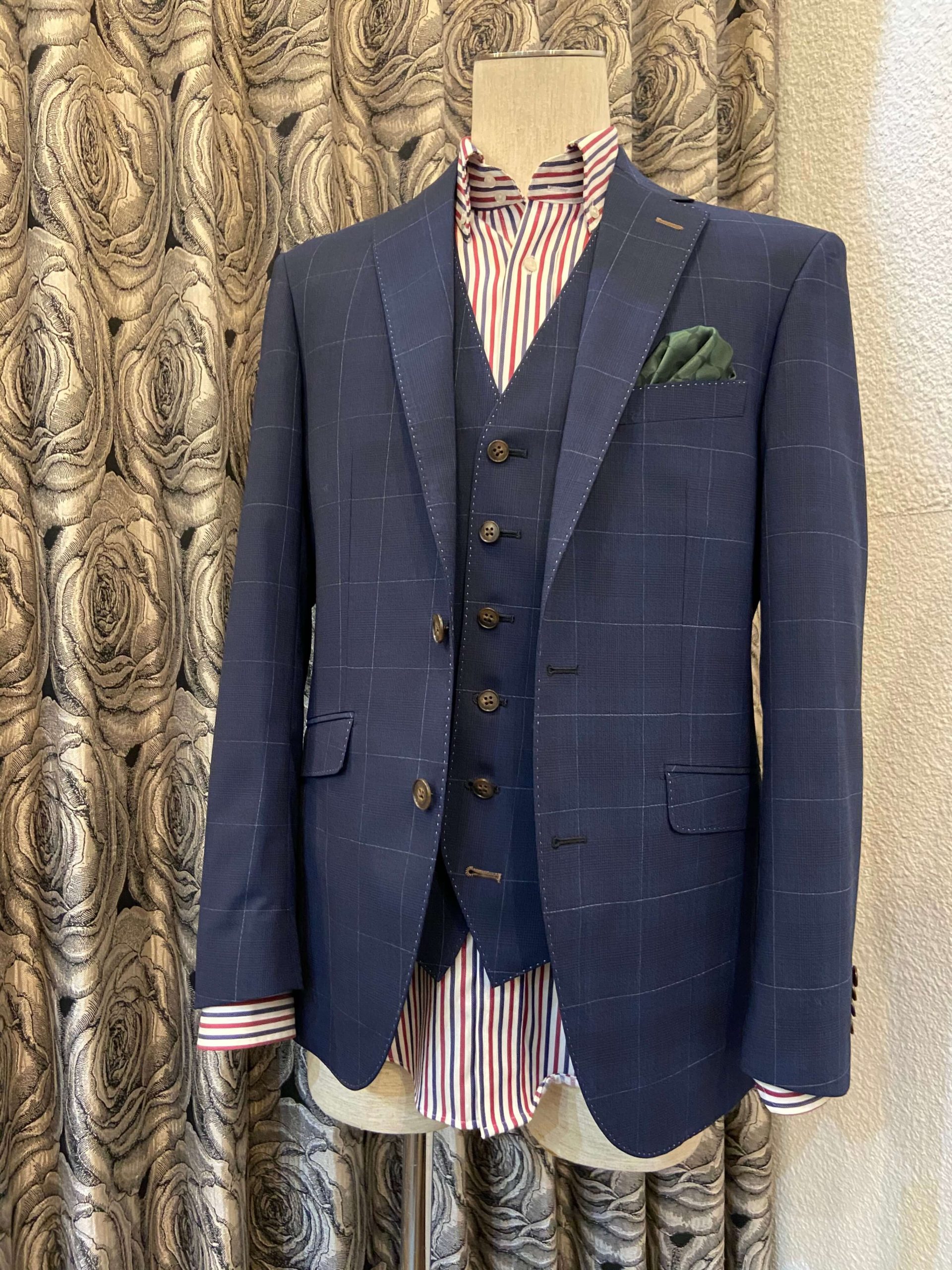この季節ならでは楽しめるライト系のネイビー色をベースに柔らかい表情の中でもしっかりと印象に残るようなインパクトをもたせてくれるチェック柄で3Pスーツをオーダー頂きました。