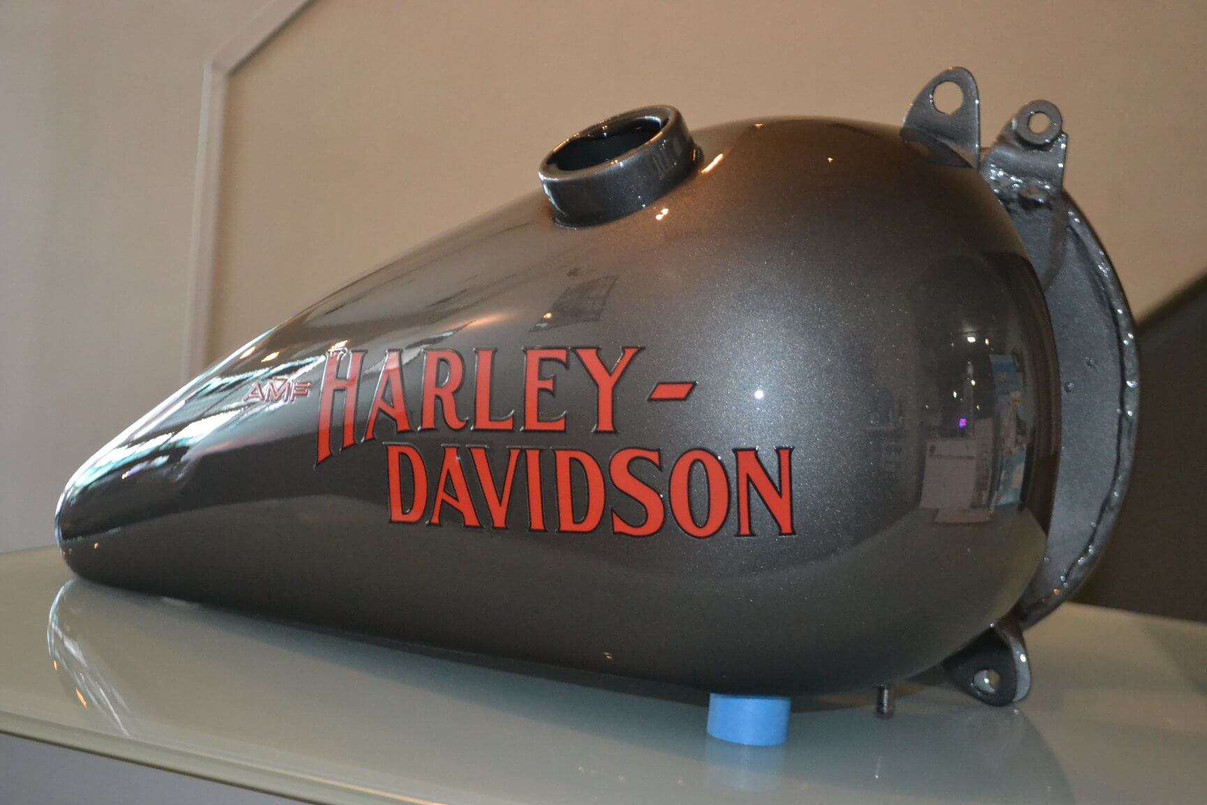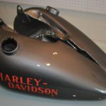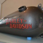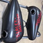 Harleyエンブレムの位置を決める為にタンクを仮付けし、デカールを貼付けます。